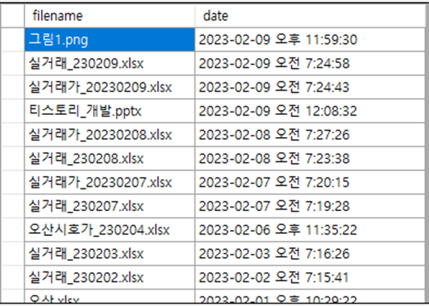 위 소스에서 folderInfo 에 들어간 데이터는 아래와 같다. 해당 데이터를 내림차순 정렬해서 가장 상단에 있는 데이터를 호출하면 가장 최근 생성된 파일명을 호출할 수 있다.