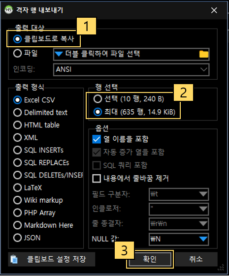 HeidiSQL에서 select한 결과값을 드래그해서 컨트롤+C 하면 전체가 복사되지 않고 셀하나만 복사가 된다. 드래그한 값들을 모두 클립보드에 복사하기 위해서는 격자 행 내보내기 기능을 사용해야 한다.