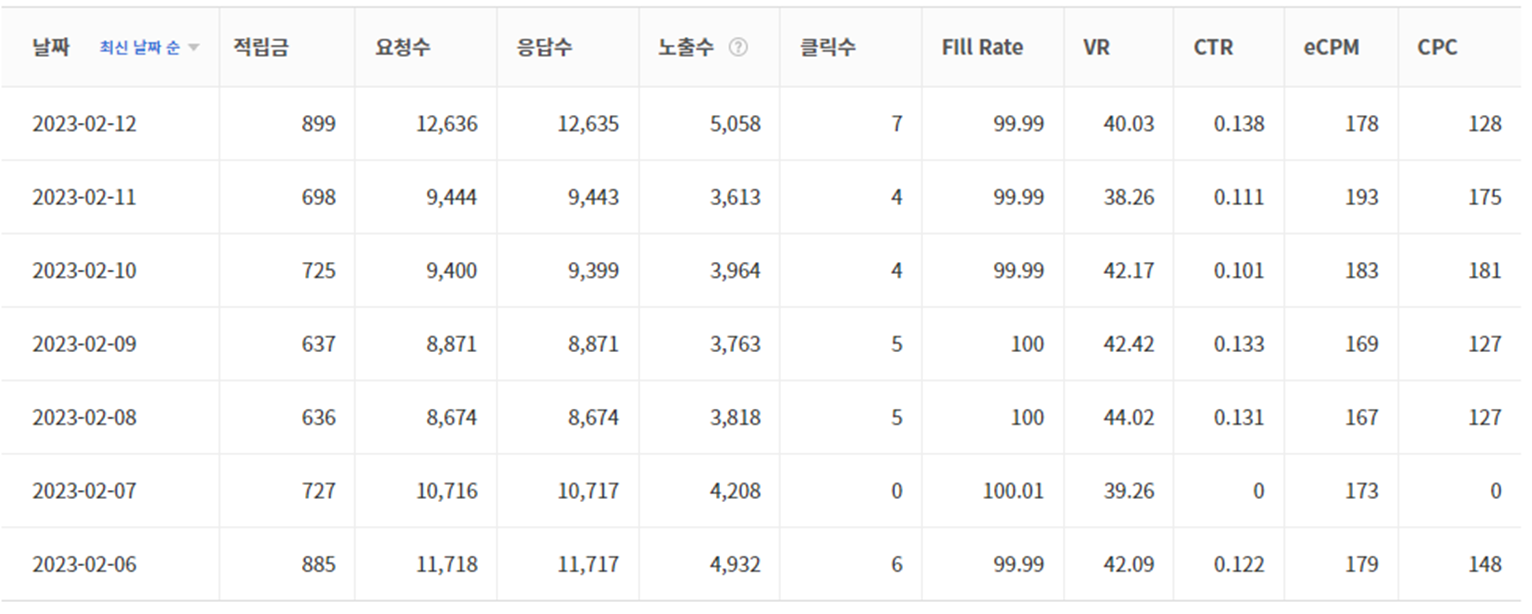 | 일자 | 적립금 | 방문자 | 광고노출수 | 클릭수 | 클릭단가 | 1천회 노출단가 |