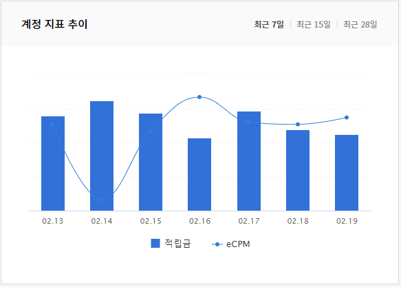 이번주에는 방문자 1명 당 0.85원이 발생했다. 2월 14일에 1,359명이 방문해서 적어도 1천원은 넘는 수익이 발생할 것이라 생각했는데 967원이 수익이 났다. 아무래도 애드핏에서 수익 1천원을 넘게 주지 않으려는 로직이 있지 않나 의심이 생길 정도이다. 일주일 방문자수가 5천명이나 6천명이나 수익은 똑같이 5천원이 발생했고, 방문자수가 1천명이 넘는 날은 광고를 2회 진행했고 1천명이 안되는 날은 광고를 1회만 진행해서 차이가 방문자수 차이가 발생했다. 아무래도 광고하는데 시간이 꽤 소비가 되는데 지금 수익으로는 굳이 시간내서 2회 광고할 필요는 없을 것 같다. 애드센스 승인이 되면 애드핏 광고를 제거하고 애드센스로 변경 후에 일방문자 3천명 정도로 바로 만들 생각이다.