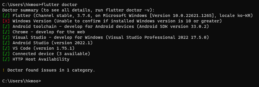 (flutter 실행파일이 존재하지 않는 "c:\users\hkmoo" 경로에서 flutter 커맨드가 먹히는 이유는 위에서 설정한 환경변수 path 설정으로 가능한 것이니 참고하면 된다)
