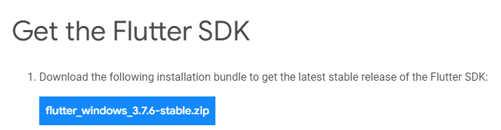 파란색 버튼으로 되어있는 "flutter_windows_3.7.6-stable.zip" 을 클릭하여 다운로드 한다.