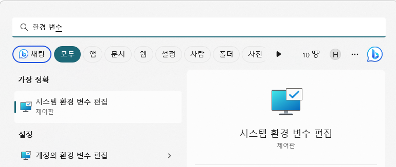 윈도우키를 눌러서 "환경 변수"를 검색하면 "시스템 환경 변수 편집" 메뉴가 조회된다. 클릭하여 들어가자.