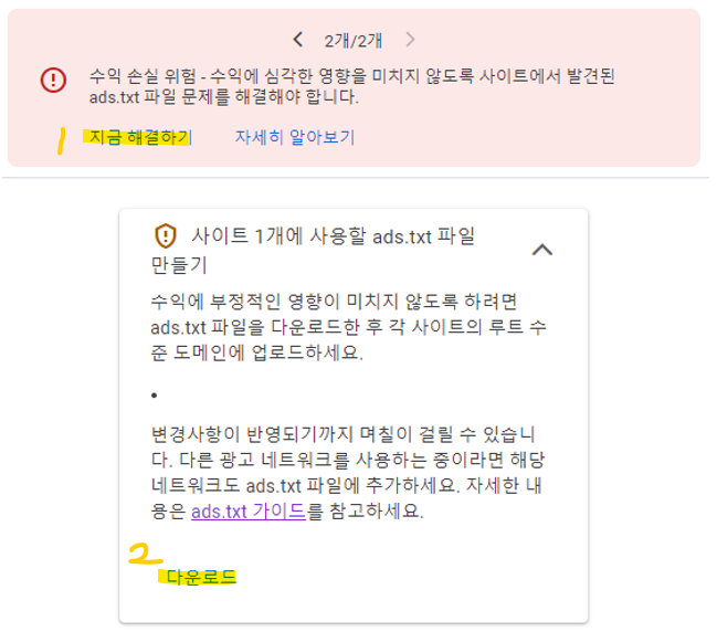 ads.txt 파일은 구글에서 제공해 준다. 알림창 하단에 "지금 해결하기" 링크를 누르면 내 애드센스 설정값이 들어가 있는 ads.txt 파일을 다운로드할 수 있다.
