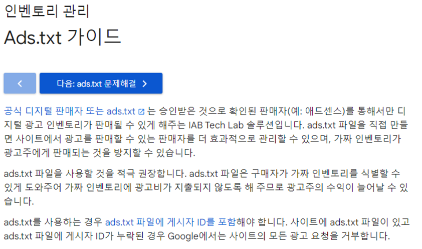 내용을 정확히는 이해하지 못했지만 가짜 인벤토리(사이트, 블로그 등)를 식별할 수 있도록 하는 인증서 같은 것으로 이해했다. 광고를 판매하는 애드센스 사용 사이트를 식별하여 광고주에게 가짜 인벤토리에 광고비가 지출되는 걸 막아준다는 내용이다. 광고주는 자신이 정한 한도 내에서 애드센스 광고 노출이나 클릭 횟수에 따라서 금액이 차감되는데 엉뚱한 사이트 광고 노출로 인해서 광고비가 지출되면 판매자나 광고주 모두 피해를 보게 되어 만들어진 기능인 것 같다.
