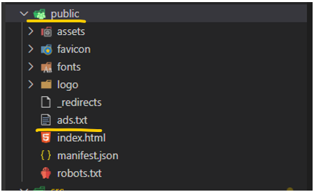 react에 어떻게 적용하나 생각하다가 일반 js 파일 소스처럼 만들어서 처리하려니 export가 url을 쳤을 때 바로 인식되도록 호출하는 건 안 되는 거 같고 이런저런 많은 방법이 있다고 하는데 그냥 다운로드한 ads.txt파일을 react 소스파일 /publc 폴더에 넣어주면 끝난다.