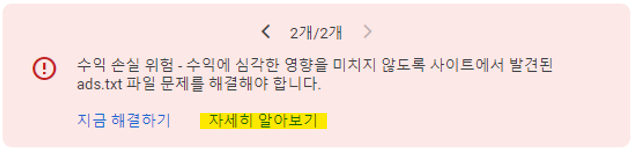 구글 애드센스 사용 1주일 정도 지나고 "수익 손실 위험 - 수익에 심각한 영향을 미치지 않도록 사이트에서 발견된 ads.txt 파일 문제를 해결해야 합니다."라는 알림을 받았다.