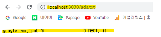 테스트로 디버깅 중에 접근해 보니 정상적으로 ads.txt 파일이 열리는 것을 확인할 수 있다. 배포 후에도 정상적으로 동작했다.