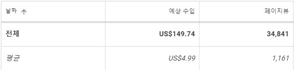 4월에는 149달러가 들어왔고 페이지뷰는 3만 4천 정도가 나왔다. 내가 운영하는 사이트 특성상 방문자수 늘리는건 어렵지 않기 때문에 조금만 시간을 투입하면 월 300달러는 어렵지 않을 것 이라 생각했다.