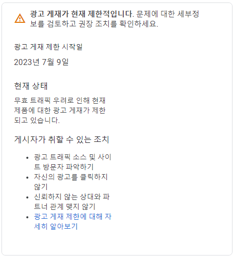 자세한 내용을 보기 위해서 "정책 센터" 링크를 클릭하니 "무효 트래픽 우려로 인해 현재 제품에 대한 광고 게재가 제한되고 있습니다." 라는 위반사항이었습니다.