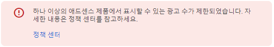 그래서 애드센스 계정에 로그인해 보니 "하나 이상의 애드센스 제품에서 표시할 수 있는 광고 수가 제한되었습니다. 자세한 내용은 정책 센터를 참고하세요."라는 메시지의 경고였어요.