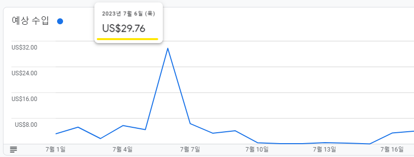 특히 7월 6일에 무슨 광고가 클릭되었는지는 모르겠지만 1 클릭에 25달러 정도가 들어와서 수익이 발생했습니다. 이번달은 수익 크게 발생하겠다고 좋아하고 있었는데 아래에 보시면 광고제한으로 7월 10~15일까지 수익이 거의 0원이어서 1클릭에 25달러짜리를 도로 뱉어내는 상황이 되었습니다.
