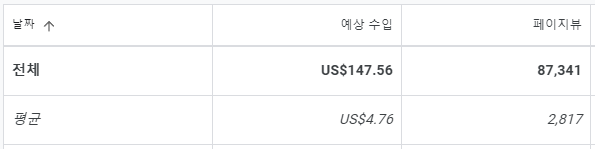 페이지뷰는 평균 2,817이 나왔고 147달러 정도의 수입이 발생했습니다. 6월과 비교해 보면 페이지뷰는 일 평균 1,000이 늘었음에도 수입차이가 크게 나지 않았습니다. 그래도 일 평균 수익은 4.35 -> 4.76 달러로 0.4 달러 정도 증가했습니다.