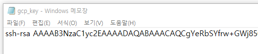 그 중에 공개키인 gcp_key.pub 파일을 메모장으로 열어보면 보안키 값들이 있는데 이 값을 복사하면 됩니다.