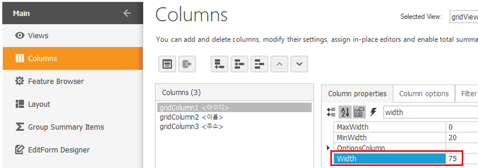DevExpress GridView에서 칼럼의 크기를 자동으로 조절되도록할 수 있다. 기본으로 칼럼을 생성하면 width=75 사이즈로 되어있는데 실제 컴파일해보면 크기는 반영되지 않는다.