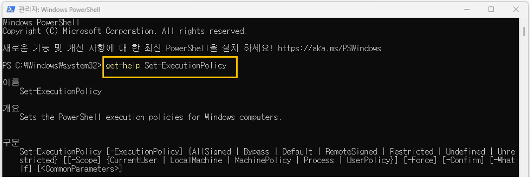 2. "get-help Set-ExecutionPolicy"를 입력한다. 실행 정책에 대한 관련 도움말과 프로그램을 설치한다.