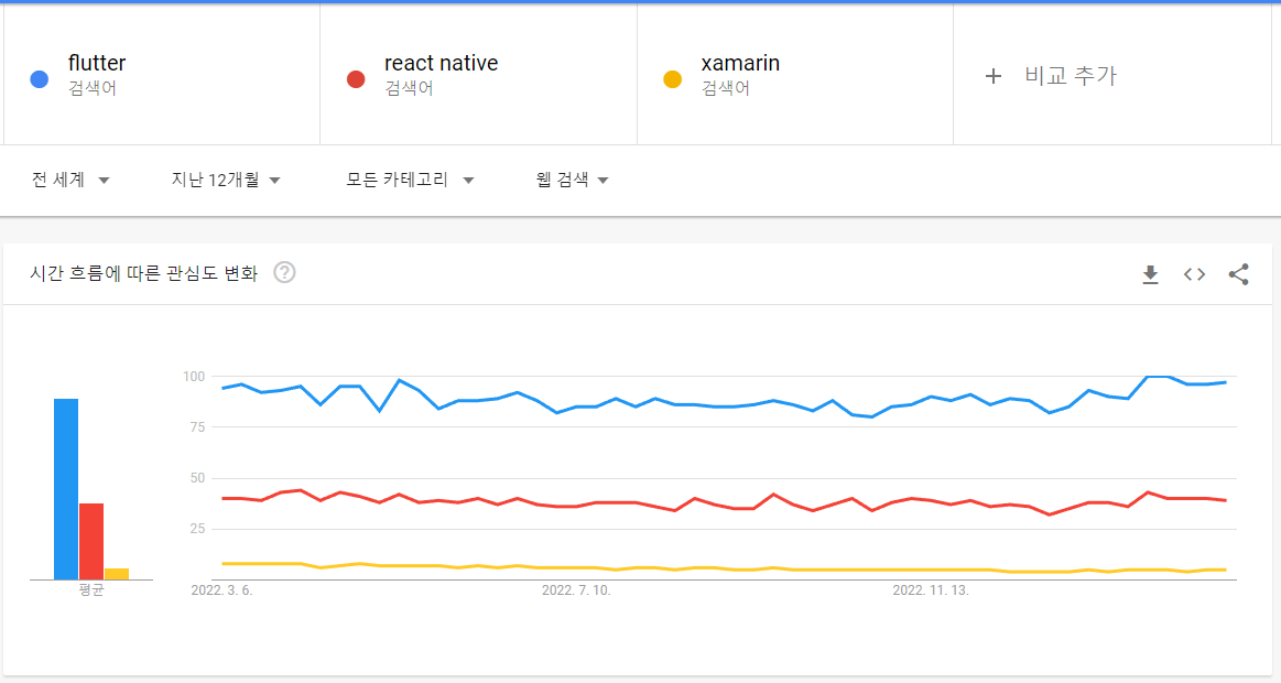 flutter vs react native vs xamarin 최근 1년 구글 웹검색 트렌트