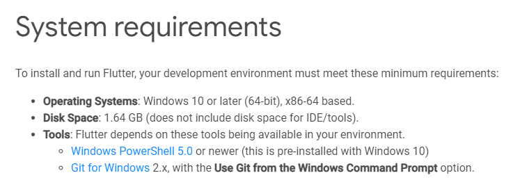 운영체제는 윈도우 10이상, 용량은 1.64GB, 툴은 파워쉘과 git을 필요로 하는데 git은 건너뛰어도 된다. 그리고 용량은 어차피 안드로이드 스튜디오를 설치하려면 꽤 많은 용량을 필요로 하기 때문에 어느정도 용량을 확보해 두어야 한다.