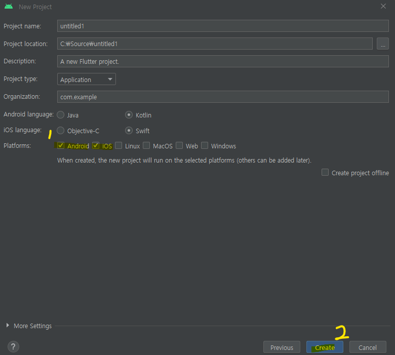 사용할 platforms를 선택하고 Create를 눌러서 프로젝트를 생성한다. 나는 Android와 iOS 플랫폼만 사용할 예정이어서 두개만 선택했다.
