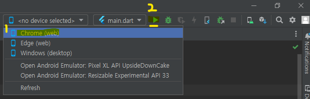 화면 우측에 build 툴바에서 <no device selected>를 선택 후 Chrome(Web)를 클릭한다. 그 후에 아래 이미지 2번의 build 버튼을 눌러서 웹으로 chrome에 빌드한다.