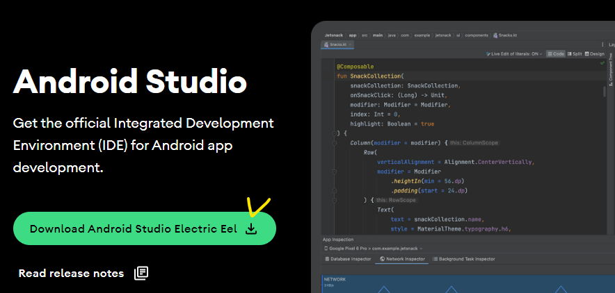 "Download Android Studio Electric Eel" 버튼을 클릭하여 다운로드 한다. 다운로드가 완료되면 파일을 더블클릭해서 설치를 시작하면 되고 옵션 변경없이 계속 다음을 눌러서 설치를 완료하면 된다.