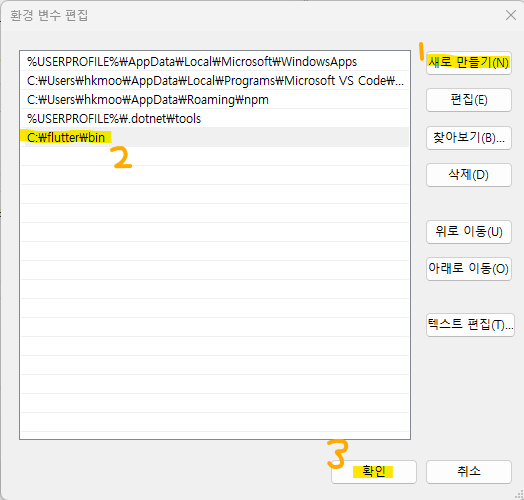 환경 변수 편집 팝업에서 "새로 만들기"를 클릭하고 flutter sdk가 위치한 "c:\flutter\bin" 경로를 입력해준다. 그리고 확인 버튼을 눌러 환경변수 path 설정을 마친다. 환경변수 path에 flutter sdk를 등록했기 때문에 해당 경로 내에 있는 파일들을 powershell에서 현재 경로에 상관없이 실행할 수 있게되었다.