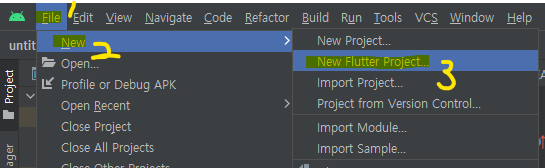 안드로이드 프로젝트에서 File -> New -> New Flutter Project 선택