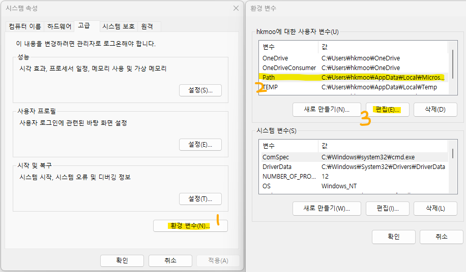팝업 메뉴에서 "환경 변수" 클릭하면 팝업되는 창에서 변수 path를 선택하고 "편집"을 클릭하자.