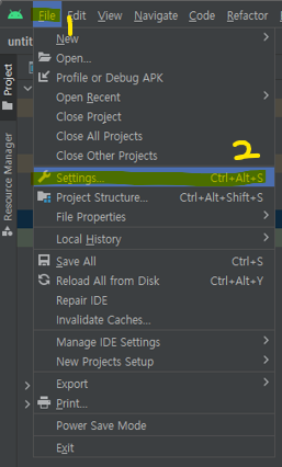 안드로이드 스튜디오 File -> Settings 메뉴 클릭