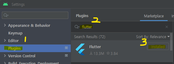 Settings 메뉴에서 나가지 말고 Plugins 메뉴를 클릭 -> flutter 검색 -> Install 버튼을 클릭하여 설치하면 완료되며 프로그램을 한번 껏다가 켜면 적용된다.