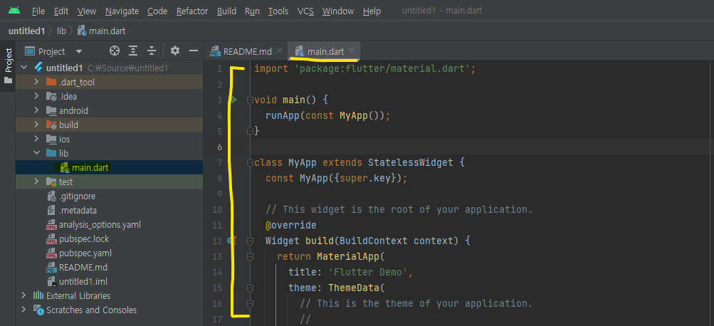 정상적으로 flutter 프로젝트가 생성됐다면 lib 폴더 안에 "main.dart" 파일이 보이고 아래와 같이 소스가 코딩되어 있을 것이다.