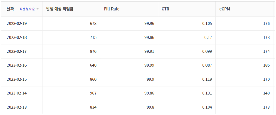 결과부터 말하면 약 7배 정도의 수익 차이가 있었다. 하지만 애드센스 광고를 송출한 최근 1주간의 평균 방문자수가 애드핏 광고를 송출한 1주간 방문자보다 20~30% 정도 적었다. 이점을 감안하면 약 10배 정도의 수익 차이가 발생하는 것 같다.