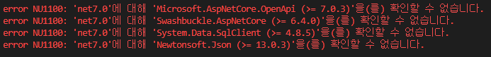 error NU1100: 'net7.0'에 대해 'Swashbuckle.AspNetCore (>= 6.4.0)'을(를) 확인할 수 없습니다.